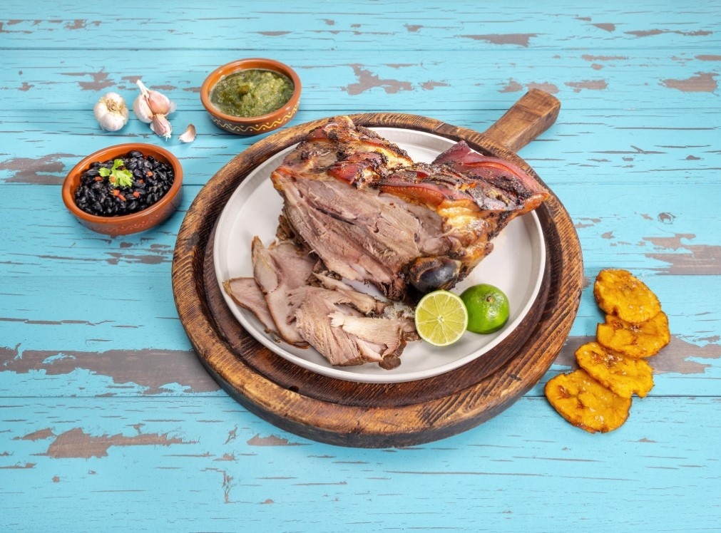 8. Retirer le porc du four et laisser reposer pendant 20 minutes, retirer la peau avec un couteau bien aiguisé, vous pouvez maintenant le trancher ou le couper en morceaux, puis les garnir de peau croustillante (chicharron).